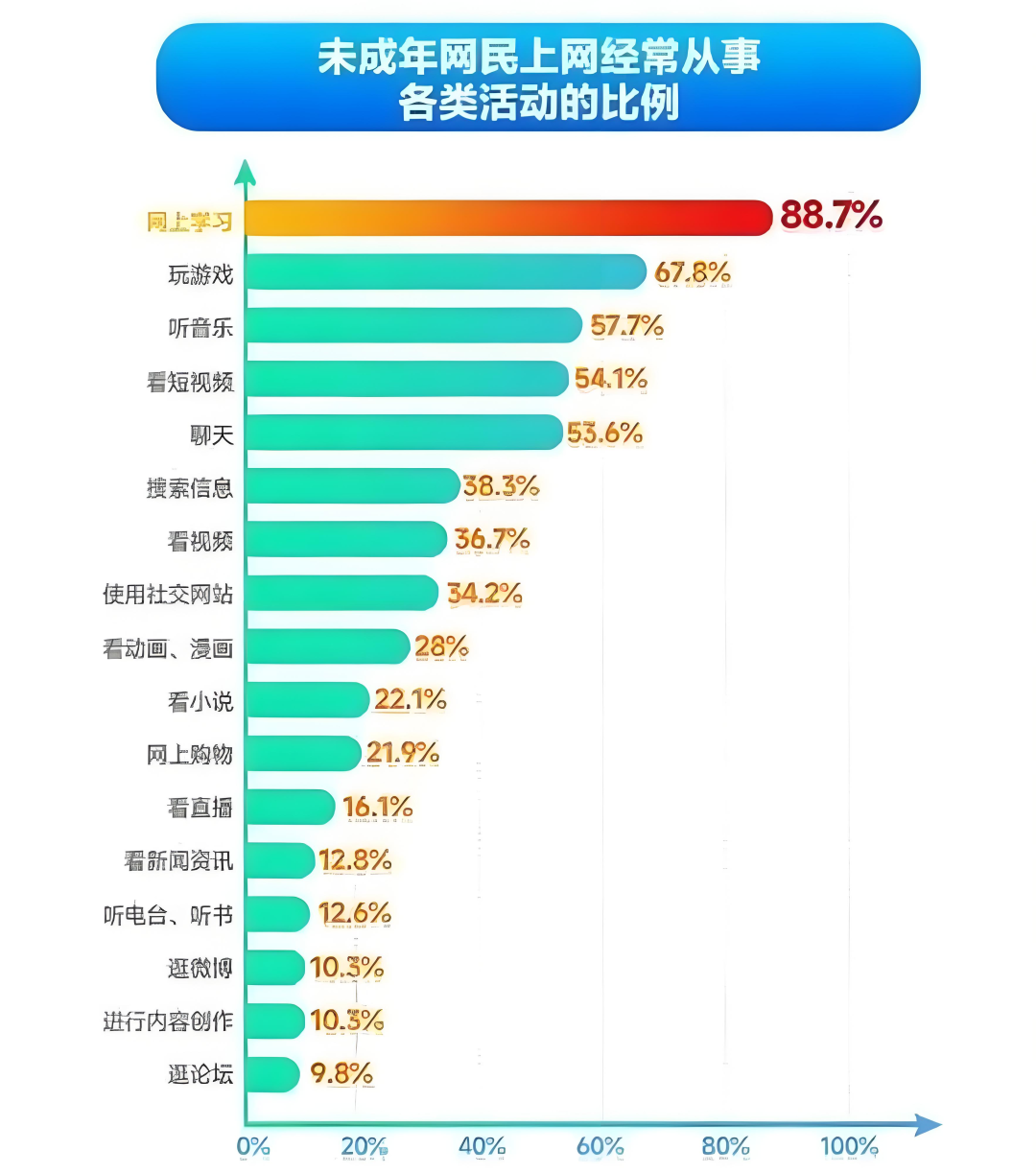 他们上网主要是进行学习和玩乐,其中学习占88.7%,玩游戏占67.8%。