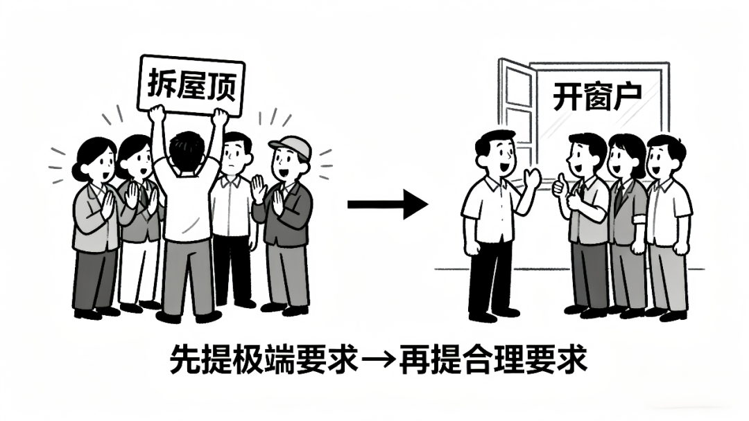 先提出一个很大、对方难以接受的要求,然后再降低条件,提出较小的、你真正想要的要求,这样对方会更容易接受。