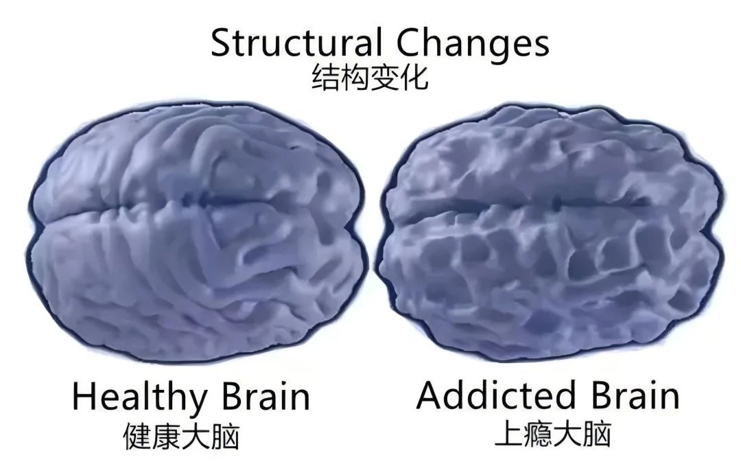 而沉迷手机上瘾的大脑,结构和患有老年痴呆的大脑一样,萎缩严重,感官刺激明显不足。