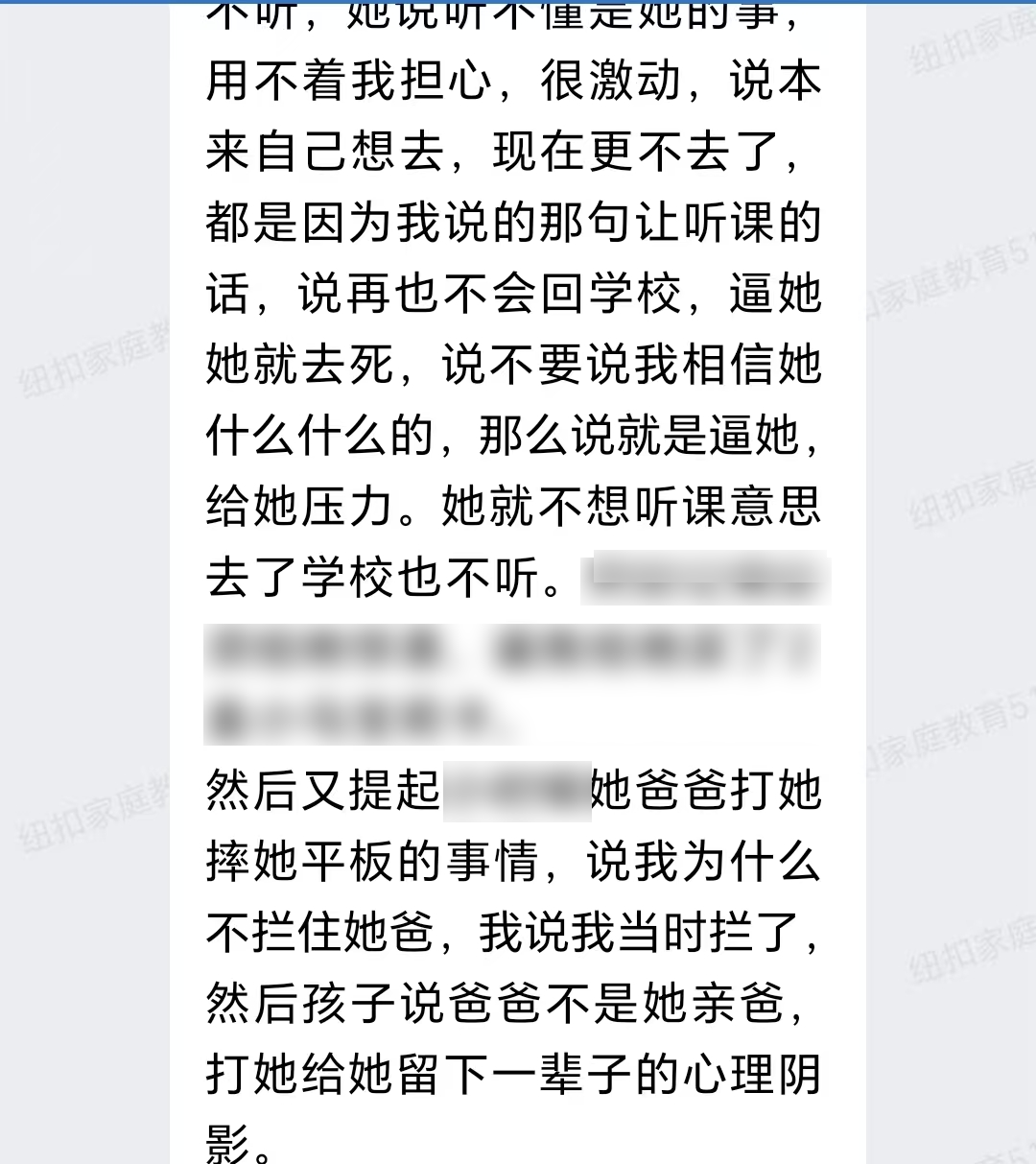 我和她爸不同意,就说我们不配当她的父母,说自己都抑郁了,我们还逼着她去上课,不知道心疼她,说着还要割腕、吃药去自杀。