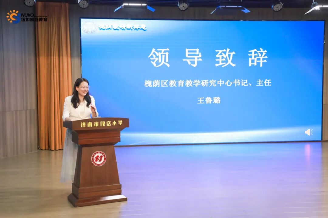济南市教研院心理教研员石建军,槐荫区教体局党组成员、教育教学研究中心主任刘彬国,槐荫区教育教学研究中心负责人王鲁璐,槐荫区融媒体中心副主任刘鹏,槐荫区教育教学研究中心副主任钟欣,槐荫区教体局思政科负责人赵青,纽扣家庭教育集团党支部书记张赫文,全区各小学主要负责同志参加现场活动。王鲁璐主任发表致辞,她系统回顾了区域心理健康教育发展成果。面向未来,王鲁璐提出将聚焦“三个持续”发展战略——深化学科课程改革、优化教师培养机制、扩大优质资源辐射,构建全域协同发展的教育教学新样态。