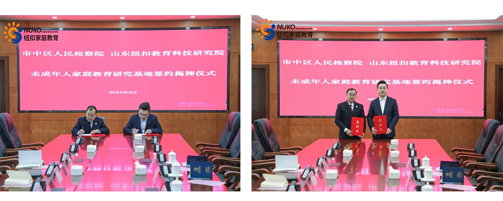 为积极探索专业化、规范化未成年人家庭教育指导工作机制,推动未成年人权益保护和犯罪预防工作。2024年2月1日,市中区检察院与纽扣教育科技研究院正式签约并揭牌成立未成年人家庭教育研究基地。在仪式上,区检察院党组书记、检察长赵性雨与纽扣家庭教育集团董事长穆居康共同为基地揭牌,并签署了《未成年人家庭教育研究协议》。区检察院党组成员、副检察长王波主持签约仪式,第三检察部负责人张瑞冬,第三检察部检察官助理薛涵、第三检察部蔡洋,纽扣教育科技研究院院长任红磊,纽扣青少年心理成长基地校长黄杰,纽扣家庭教育集团党支部书记张赫文共同出席并见证了这一重要时刻。