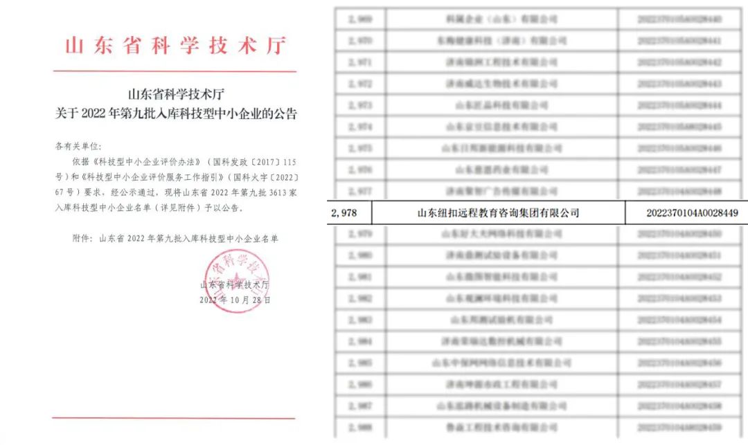 近日,山东省科学技术厅公示了关于2022年第九批入库科技型中小企业的公告,山东纽扣远程教育咨询集团有限公司(以下简称:纽扣家庭教育)成功入选。