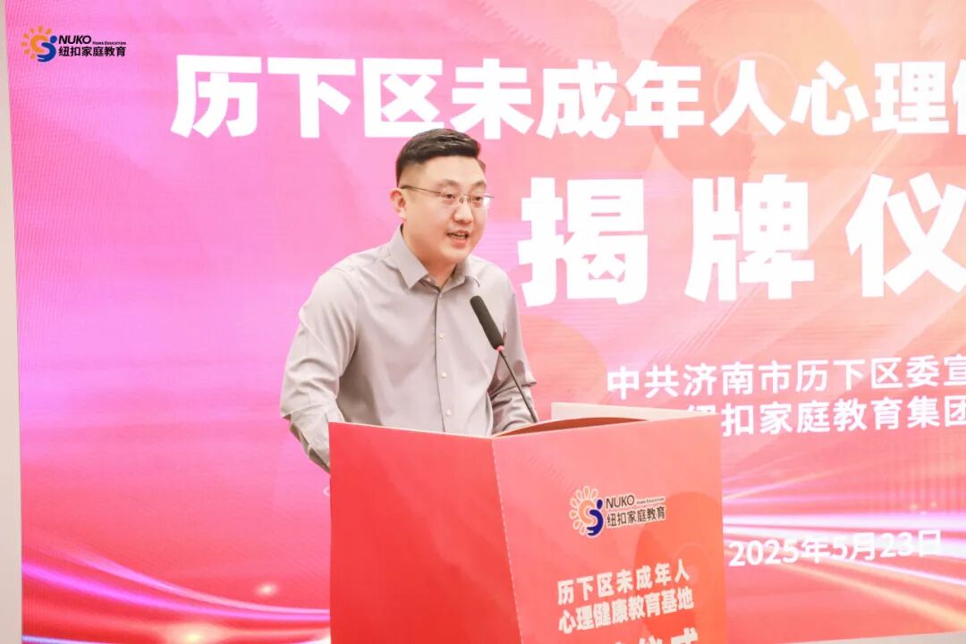 毕伟东副部长表示,基地建设是全区推进未成年人思想道德建设的重要举措。他指出,当前社会环境下未成年人面临学业、人际、家庭等多重心理压力,历下区历来高度重视未成年人心理健康,打造了线上线下心理共育网络。新揭牌基地将整合预防教育、筛查干预、人才培养等功能,形成家校社协同联动的心理健康服务体系。区委宣传部将联合各部门及纽扣家庭教育集团持续深化未成年人心理健康教育工作,为青少年营造阳光成长环境,护航未成年人身心健康发展。